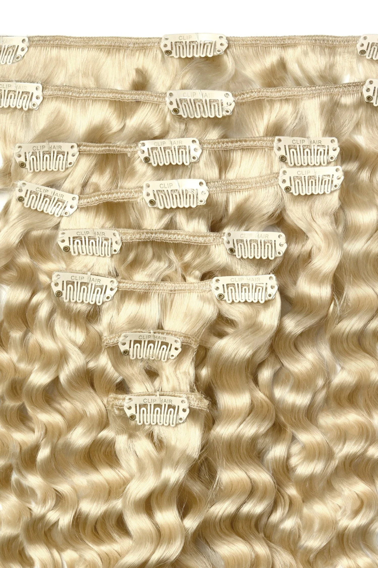 This Lightest Blonde (#60) clip in wavy hair set comes complete with 18 metal clips already attached to the wefts complete with silicone tubing for a secure grip.