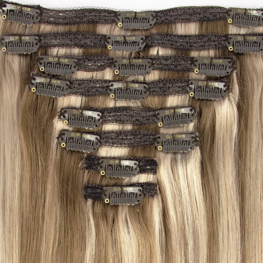 Double Wefted Full Head Remy Clip In Human Hair Extensions – Iced Cappuccino (#14/22)(Double Wefted Set Clip In Hair Extensions Blonde Mix 14 22)