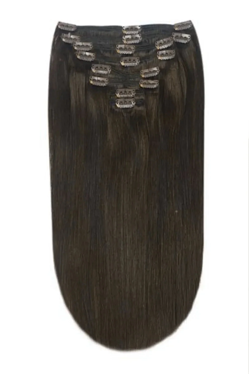 This Dark Brown clip in hair set comes complete with 18 metal clips already attached to the wefts complete with silicone tubing for a secure grip.