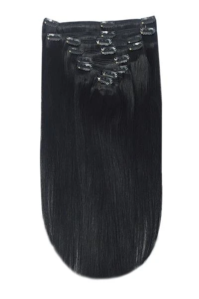 This Jet Black clip in hair set comes complete with 18 metal clips already attached to the wefts complete with silicone tubing for a secure grip.