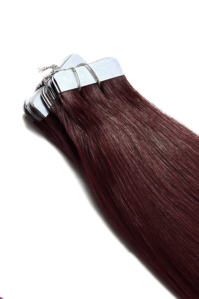 Our stunning Mahogany Red (#99J) Tape In Hair Extensions are made with silky soft human hair, making them easy to wash and style. Our silky soft Tape-In Hair extensions are made from 100% Remy, Human hair. With correct care and maintenance your tapes will last minimum 3 months.